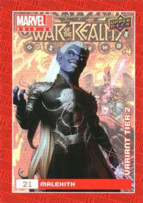The Malekith 2019 Upper Deck Marvel Annual #21 Variant Cover card is 1 of 9 Malekith's card variations in the 2019 Upper Deck Marvel Annual set being tracked by Sports Card Investor, including Base, Fractal, Pack Wars, Hologram /20, and Printing Plate Cyan /1.