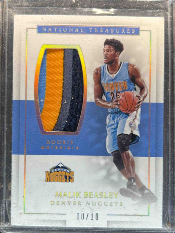 The Malik Beasley 2016 National Treasures #24 Rookie Materials - Gold /10 card is 1 of 28 Malik Beasley's card variations in the 2016 National Treasures set being tracked by Sports Card Investor, including #162 Base /99, #112 Base /99, #112 Rookie Patch Auto /99, #112 Rookie Patch Auto - Gold /10, and #112 Rookie Patch Auto - Emerald /5.