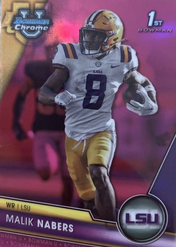The Malik Nabers 2023 Bowman Chrome University #74 Prospects - Pink Refractor (1st) card in Raw condition has moved up $3.26 (+329%) in the last 30 days and was last sold for $4.25 .