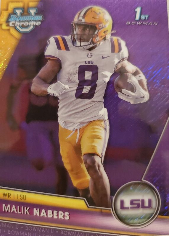 The Malik Nabers 2023 Bowman Chrome University #74 Prospects - Purple Shimmer Refractor (1st) card in Raw condition has not changed in price in the last 30 days and was last sold for $5.00 .