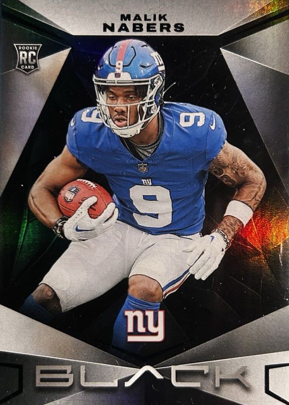 This card is 1 of 12 Malik Nabers' card variations in the 2024 Black set being tracked by Sports Card Investor, including Royal /99, Sapphire /35, Citrine /25, Emerald /15, and Gold /10.