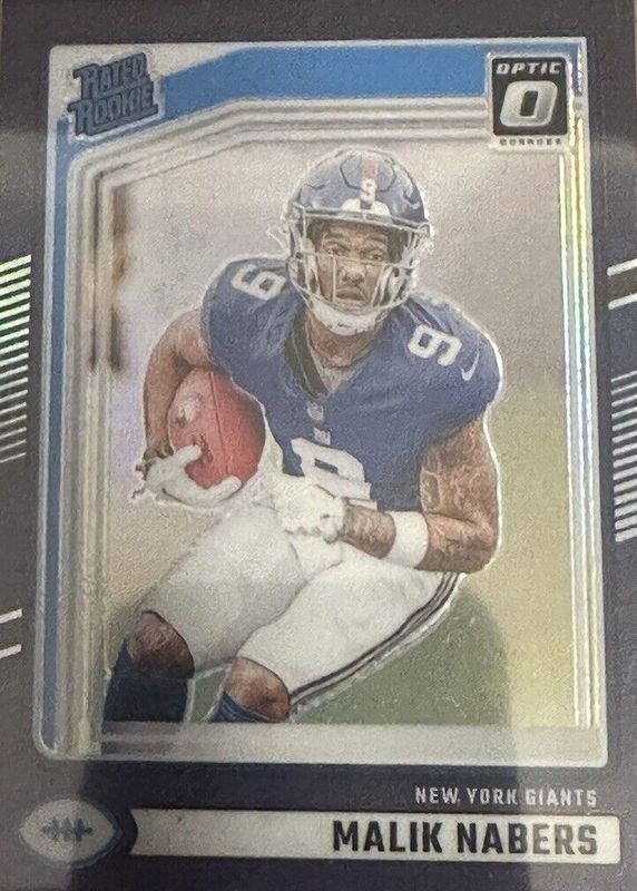 The Malik Nabers 2024 Donruss #383 Optic Preview - Purple /50 Rookie card in Raw condition has not changed in price in the last 30 days and was last sold for $49.99 .