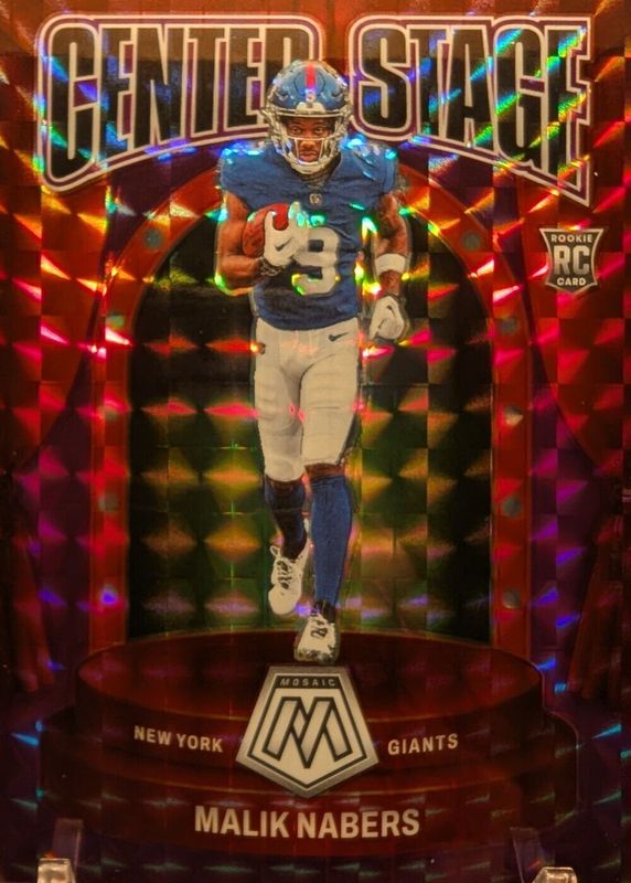 The Malik Nabers 2024 Mosaic #3 Center Stage - Purple /49 Rookie card in Raw condition has not changed in price in the last 30 days and was last sold for $35.00 .