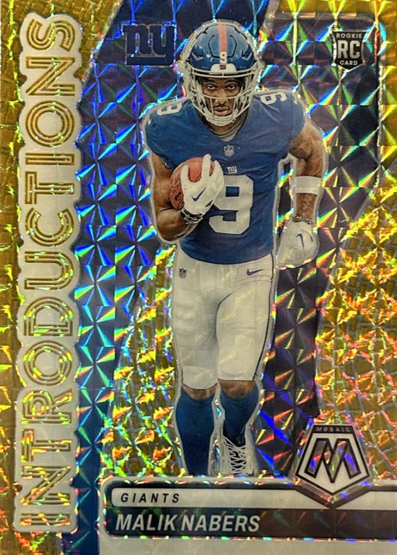 The Malik Nabers 2024 Mosaic #4 Introductions - Gold /10 Rookie card in Raw condition has not changed in price in the last 30 days and was last sold for $134.50 .