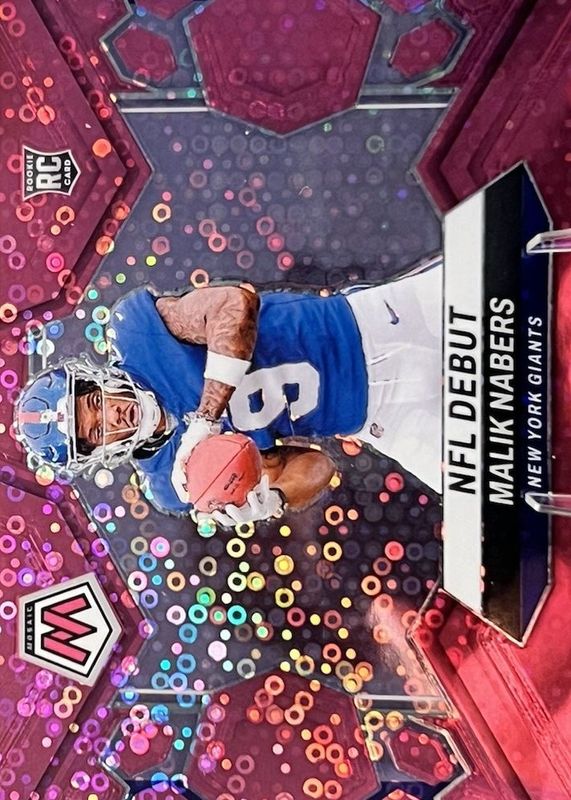 The Malik Nabers 2024 Mosaic #284 NFL Debut - No Huddle Pink /20 Rookie card in Raw condition has not changed in price in the last 30 days and was last sold for $136.50 .