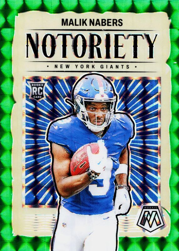The Malik Nabers 2024 Mosaic #23 Notoriety - Green Rookie card in Raw condition has moved down -$0.99 (-49.7%) in the last 30 days and was last sold for $1.00 .