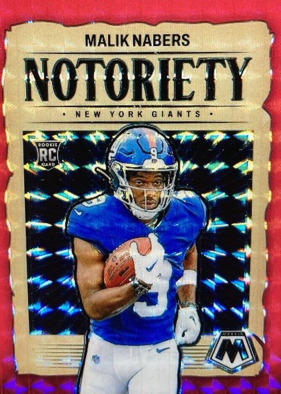 The Malik Nabers 2024 Mosaic #23 Notoriety - Pink Fluorescent /10 Rookie card in Raw condition has not changed in price in the last 30 days and was last sold for $96.00 .