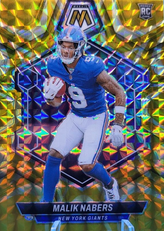 The Malik Nabers 2024 Mosaic #306 Reactive Yellow Rookie card in Raw condition has moved up $2.00 (+50.0%) in the last 30 days and was last sold for $6.00 .
