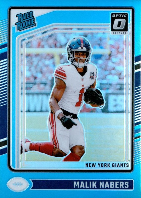 The Malik Nabers 2024 Optic #271 Aqua /299 Rookie card in Raw condition has moved up $26.03 (+81.3%) in the last 30 days and was last sold for $58.03 .