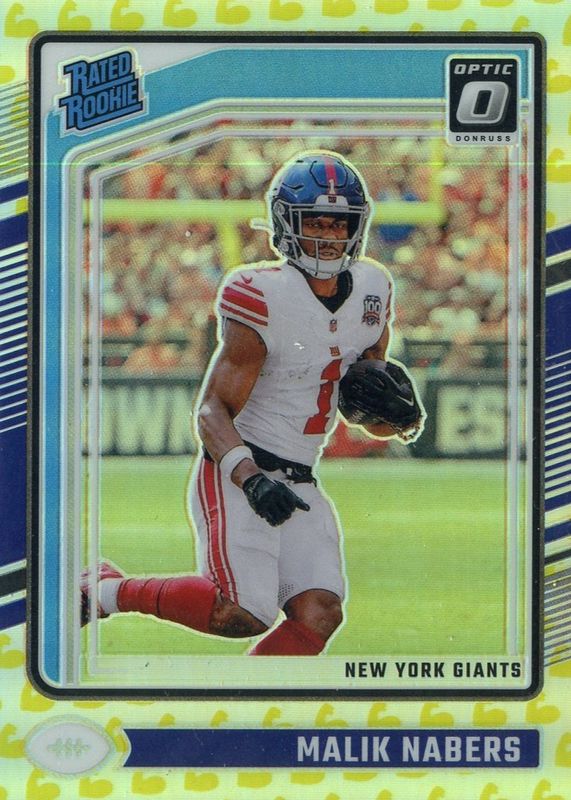 This card is 1 of 101 Malik Nabers' card variations in the 2024 Optic set being tracked by Sports Card Investor, including Base, Blue Hyper, Blue Scope, Green Hyper, and Green Velocity.