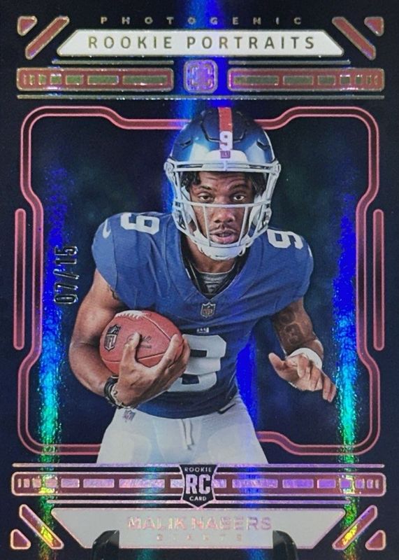 This card is 1 of 9 Malik Nabers' card variations in the 2024 Photogenic set being tracked by Sports Card Investor, including Rookie Portraits, Rookie Portraits - Silver /150, Rookie Portraits - Blue /99, Rookie Portraits - Purple /75, and Rookie Portraits - Red /49.