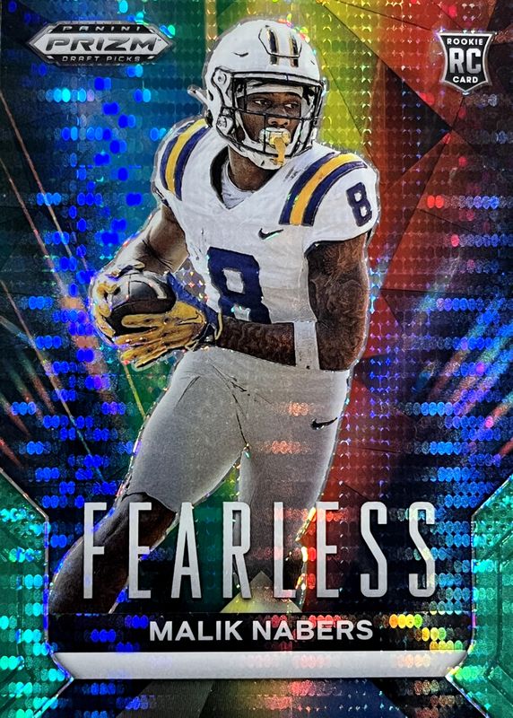 The Malik Nabers 2024 Prizm Draft Picks #F-MN Fearless - Green Pulsar /25 Rookie card in Raw condition has not changed in price in the last 30 days and was last sold for $25.00 .