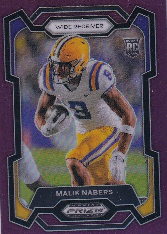 The Malik Nabers 2024 Prizm Draft Picks #109 Purple /75 Rookie card in Raw condition has not changed in price in the last 30 days and was last sold for $21.00 .