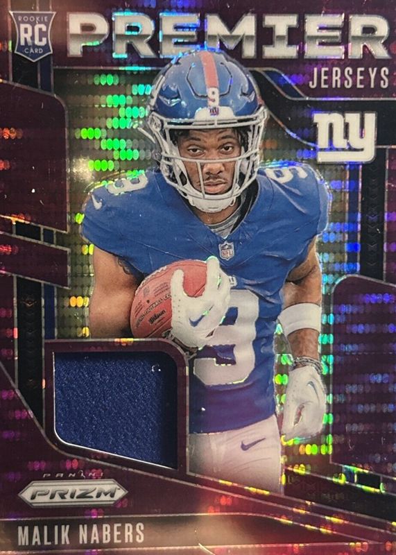 The Malik Nabers 2024 Prizm #PJ-MNS Premier Jerseys - Purple Pulsar Rookie card in Raw condition has moved up $4.56 (+229%) in the last 30 days and was last sold for $6.55 .