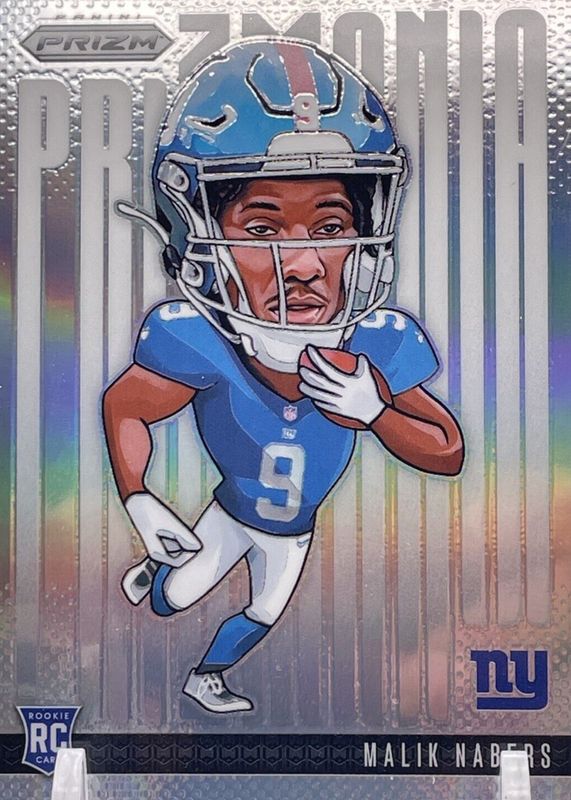 The Malik Nabers 2024 Prizm #5 Prizmania /(SSP) Rookie card in Raw condition has not changed in price in the last 30 days and was last sold for $560.00 .