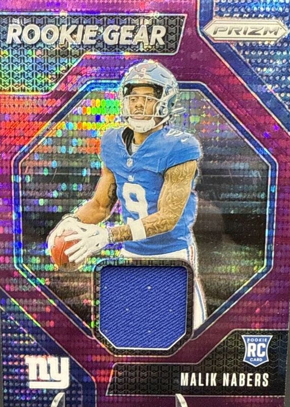 The Malik Nabers 2024 Prizm #RG-MNS Rookie Gear - Purple Pulsar card in Raw condition has not changed in price in the last 30 days and was last sold for $3.99 .