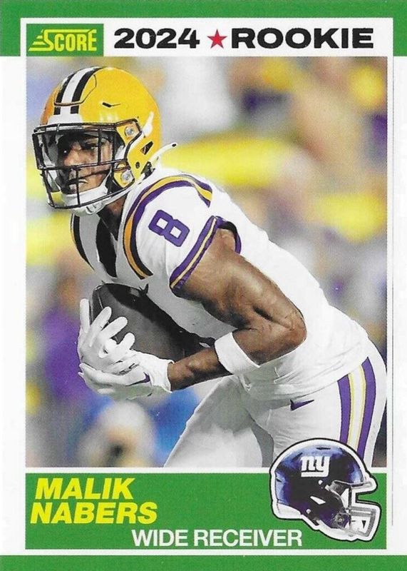 The Malik Nabers 2024 Score #5 35th Anniversary Rookie card in Raw condition has moved up $14.01 (+704%) in the last 30 days and was last sold for $16.00 .