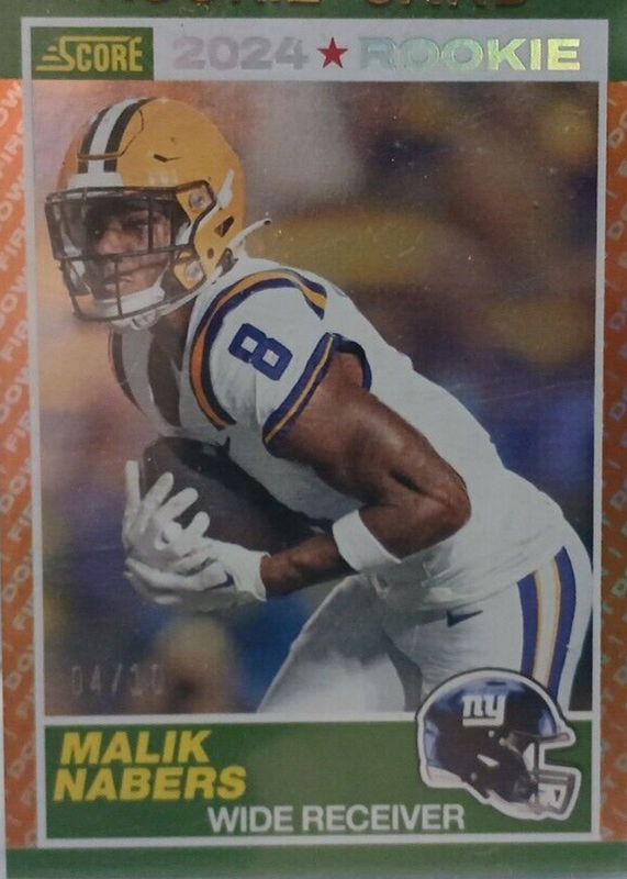 The Malik Nabers 2024 Score #5 35th Anniversary Rookie - First Down /10 card in Raw condition has not changed in price in the last 30 days and was last sold for $76.00 .