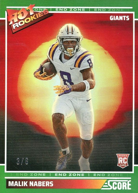 The Malik Nabers 2024 Score #6 Hot Rookies - End Zone /6 card in Raw condition has not changed in price in the last 30 days and was last sold for $9.50 .