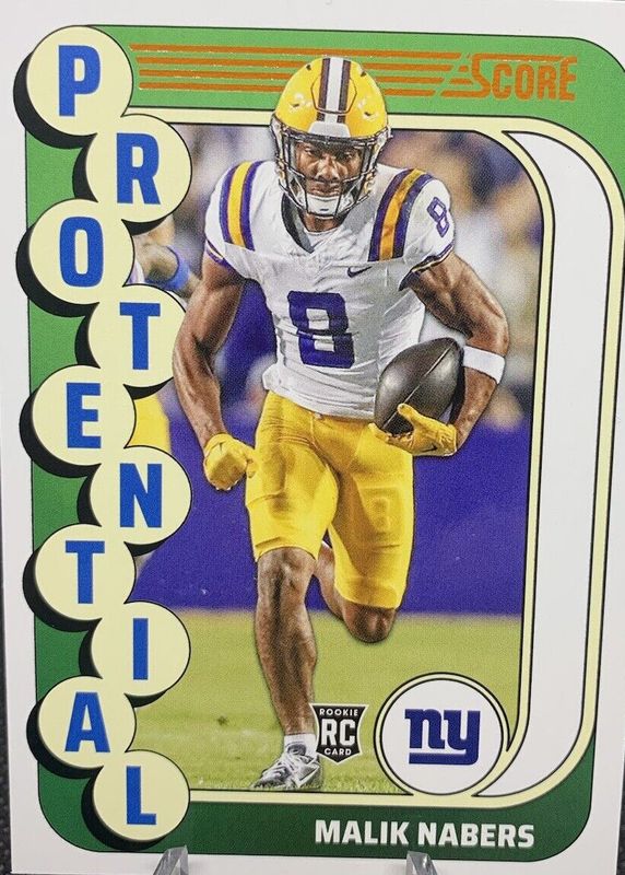 The Malik Nabers 2024 Score #4 Protential - Orange Rookie card in Raw condition has not changed in price in the last 30 days and was last sold for $0.99 .