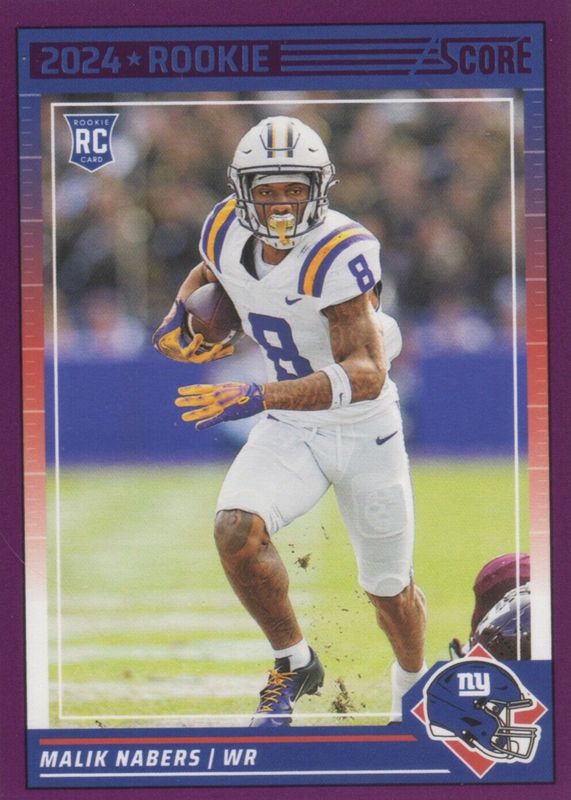 The Malik Nabers 2024 Score #306 Purple Rookie card in Raw condition has not changed in price in the last 30 days and was last sold for $2.25 .