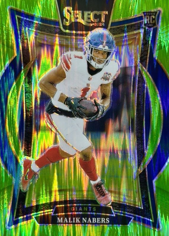 The Malik Nabers 2024 Select #29 Concourse Neon Green Shock /599 Rookie card in Raw condition has moved up $1.92 (+37.8%) in the last 30 days and was last sold for $7.00 .