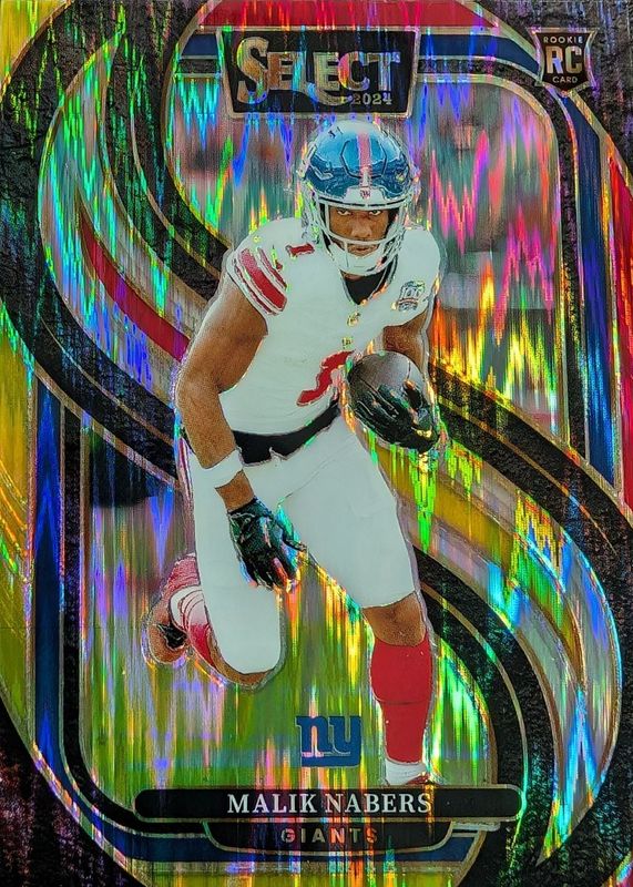 The Malik Nabers 2024 Select #116 Premier Level Red & Yellow Shock Rookie card in Raw condition has moved up $1.00 (+44.4%) in the last 30 days and was last sold for $3.25 .