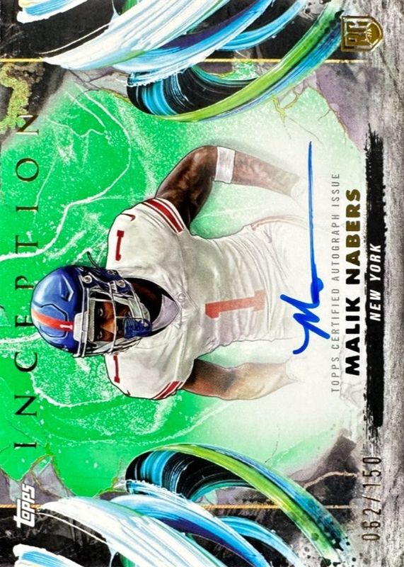 The Malik Nabers 2024 Topps Inception #RA-MN Rookie Autographs Variation - Green /150 card in Raw condition has not changed in price in the last 30 days and was last sold for $50.00 .