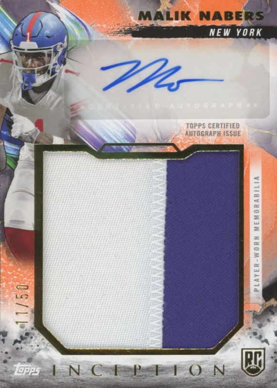 The Malik Nabers 2024 Topps Inception #RJRA-MN Rookie Jumbo Relic Autographs - Orange /50 card in Raw condition has not changed in price in the last 30 days and was last sold for $125.00 .