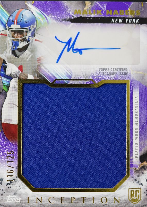 The Malik Nabers 2024 Topps Inception #RJRA-MN Rookie Jumbo Relic Autographs - Purple /125 card in Raw condition has not changed in price in the last 30 days and was last sold for $55.00 .