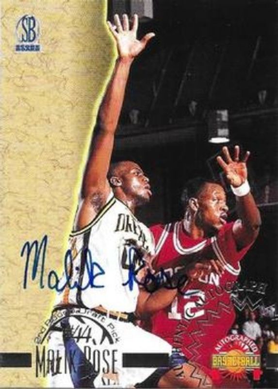 The Malik Rose 1996 Score Board Autographed Autographs Rookie card is 1 of 4 Malik Rose's card variations in the 1996 Score Board Autographed set being tracked by Sports Card Investor, including Base, Autographs - Red /400, and Autographs - Silver /325.