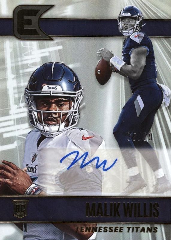 The Malik Willis 2022 Chronicles #ESS-MAW Essentials Autographs (/99) Rookie card in Raw condition has moved up $6.04 (+101%) in the last 30 days and was last sold for $12.04 .
