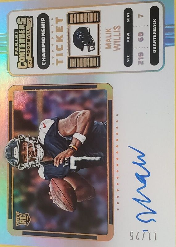The Malik Willis 2022 Contenders #129 Rookie Ticket Auto Variation - Championship Ticket /25 card in Raw condition has not changed in price in the last 30 days and was last sold for $46.00 .