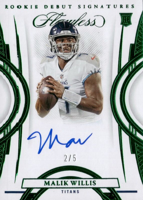 The Malik Willis 2022 Flawless #RDS-MW Rookie Debut Signatures - Emerald /5 card in Raw condition has not changed in price in the last 30 days and was last sold for $102.50 .