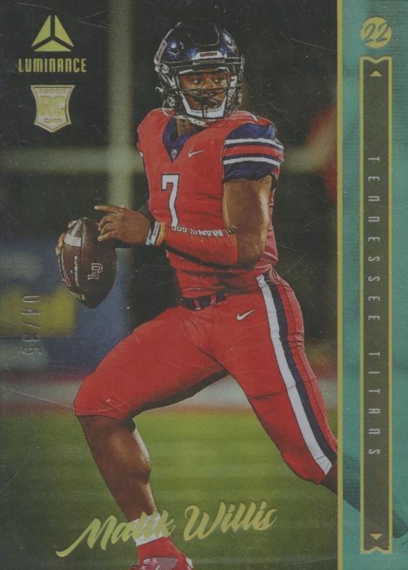 This card is 1 of 9 Malik Willis' card variations in the 2022 Luminance set being tracked by Sports Card Investor, including Base, Gold /249, Blue /149, Green /99, and Orange /50.