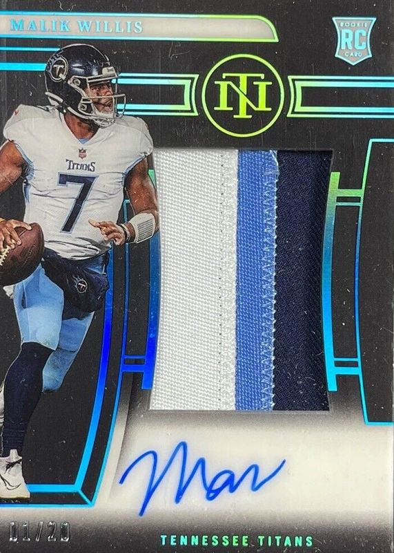This card is 1 of 20 Malik Willis' card variations in the 2022 National Treasures set being tracked by Sports Card Investor, including Crossover Rookie Patch Autographs (/99), Rookie Patch Auto - Green Jersey Number (/7), Rookie Patch Auto /99, Rookie Patch Auto - Purple /49, and Crossover Rookie Patch Autographs - Holo Silver /25.
