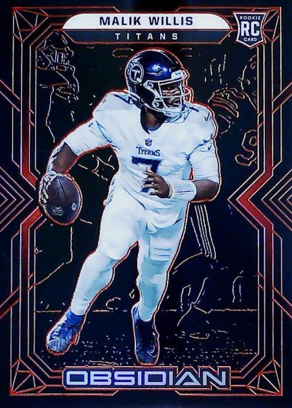 This card is 1 of 20 Malik Willis' card variations in the 2022 Obsidian set being tracked by Sports Card Investor, including Base, Electric Etch Purple /100, Electric Etch Orange /75, Electric Etch Contra /(SSP), and Electric Etch Green /50.