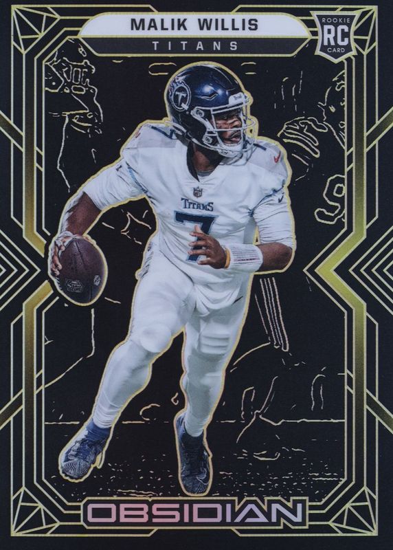This card is 1 of 20 Malik Willis' card variations in the 2022 Obsidian set being tracked by Sports Card Investor, including Base, Electric Etch Purple /100, Electric Etch Orange /75, Electric Etch Contra /(SSP), and Electric Etch Green /50.