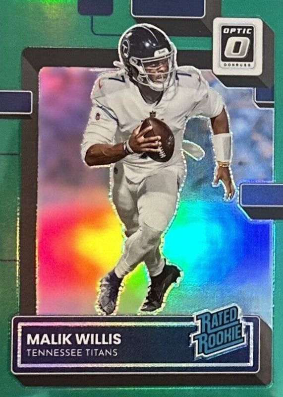 The Malik Willis 2022 Optic #203 Green /5 Rookie card in Raw condition has not changed in price in the last 30 days and was last sold for $99.99 .