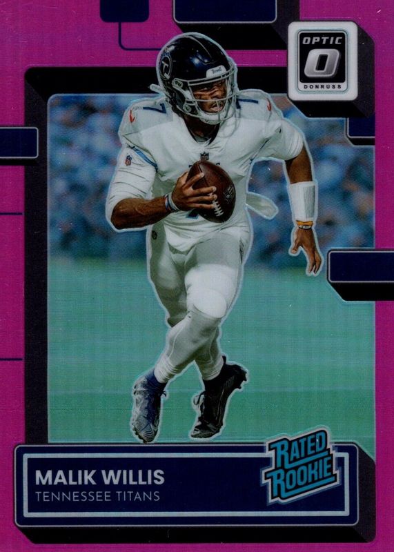 The Malik Willis 2022 Optic #203 Pink Rookie card in Raw condition has moved down -$0.25 (-5.6%) in the last 30 days and was last sold for $4.25 .