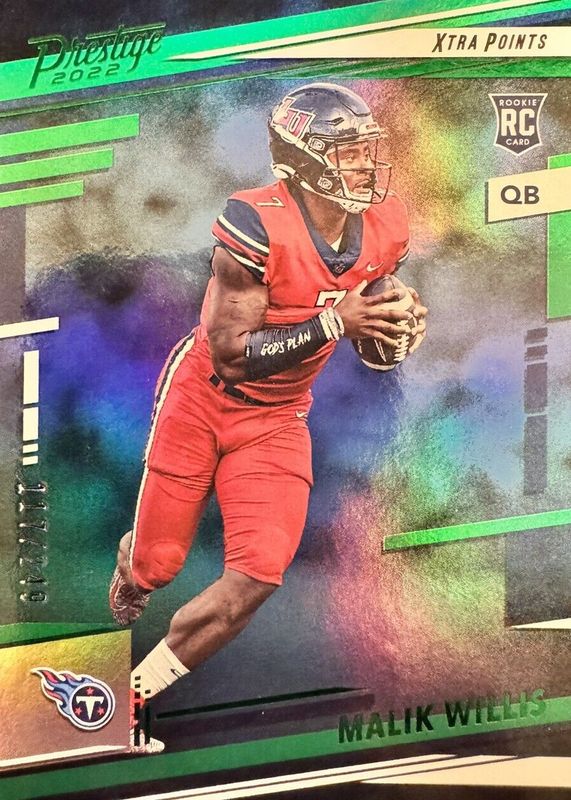 The Malik Willis 2022 Prestige #303 Xtra Points Green /249 Rookie card in Raw condition has not changed in price in the last 30 days and was last sold for $1.99 .