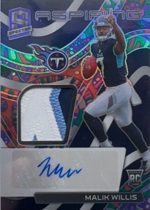 The Malik Willis 2022 Spectra #APA-MWI Aspiring Patch Autographs - Psychedelic /5 Rookie card in Raw condition has not changed in price in the last 30 days and was last sold for $69.99 .