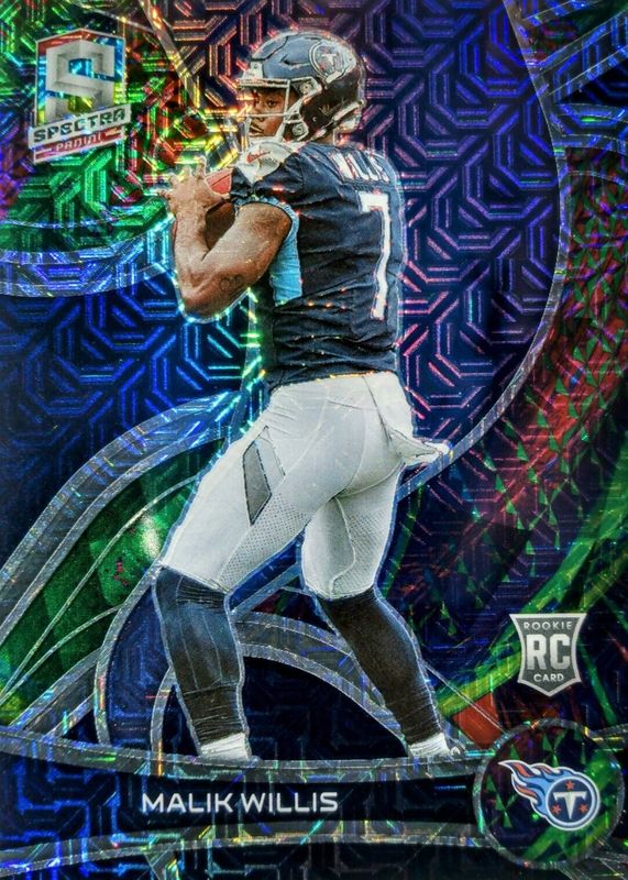 The Malik Willis 2022 Spectra #138 Meta /25 Rookie card in Raw condition has not changed in price in the last 30 days and was last sold for $8.50 .