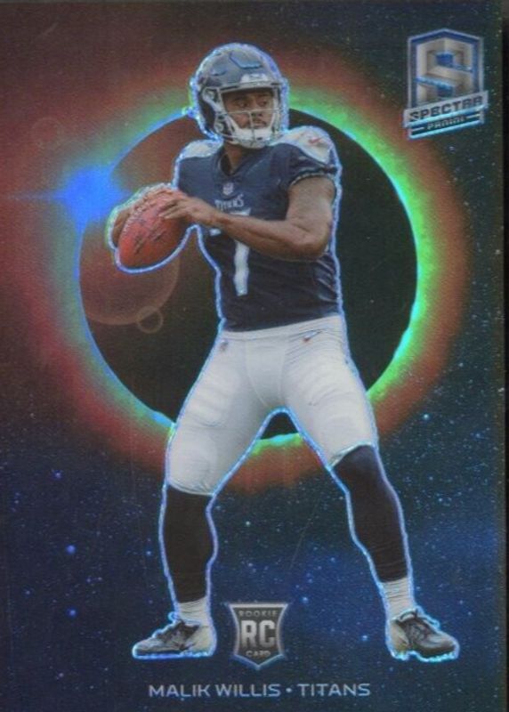 The Malik Willis 2022 Spectra #SE-10 Solar Eclipse /(SSP) Rookie card in Raw condition has not changed in price in the last 30 days and was last sold for $26.89 .