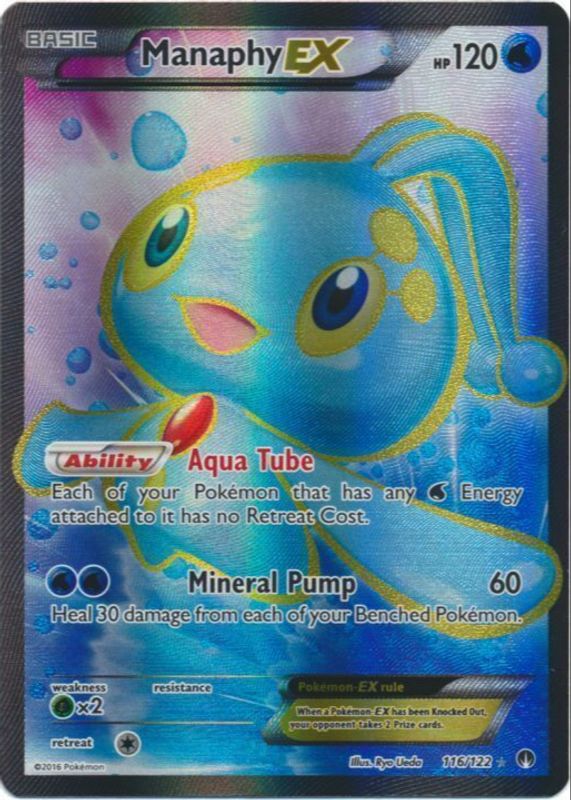 The Manaphy ex 2016 XY: BREAKpoint #116/122 Holo (Full Art) card in Raw TCG (Near Mint) condition has moved down -$0.62 (-3.0%) in the last 30 days and was last sold for $19.95 .