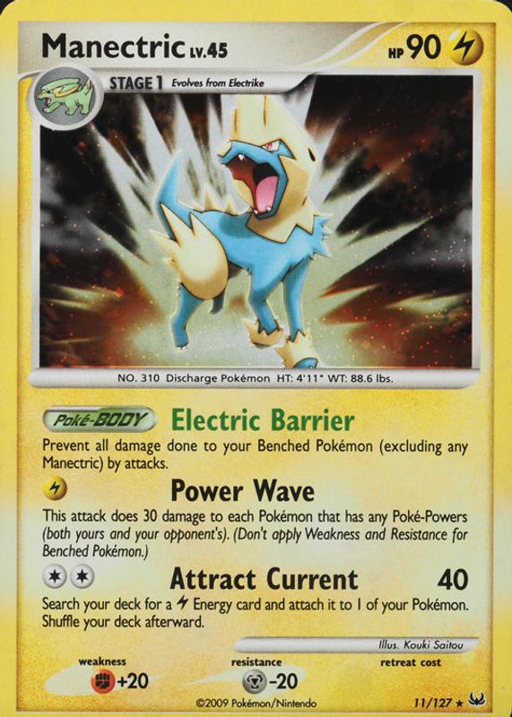The Manectric 2009 Platinum #011/127 Holo card in Raw TCG (Near Mint) condition has moved down -$4.12 (-80.6%) in the last 30 days and was last sold for $0.99 .