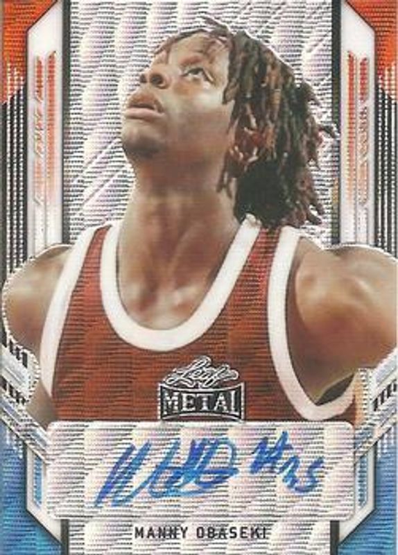 The Manny Obaseki 2021 Leaf Metal #PA-MO1 Portrait Autographs - Red White Blue Wave /7 card is 1 of 88 Manny Obaseki's card variations in the 2021 Leaf Metal set being tracked by Sports Card Investor, including Base, Silver Crystal, Silver Mojo, Silver Wave, and Blue Rainbow /50.