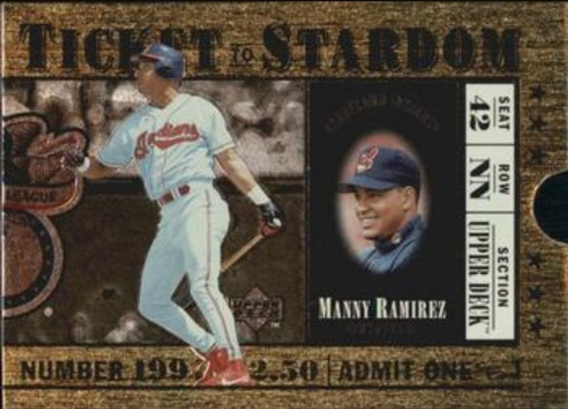 The Manny Ramirez 1997 Upper Deck #TS20 Ticket to Stardom card is 1 of 11 Manny Ramirez's card variations in the 1997 Upper Deck set being tracked by Sports Card Investor, including #345 Base, #188 Base, #AG16 Amazing Greats, #HC14 Hot Commodities, and #LD19 Long Distance Connection.