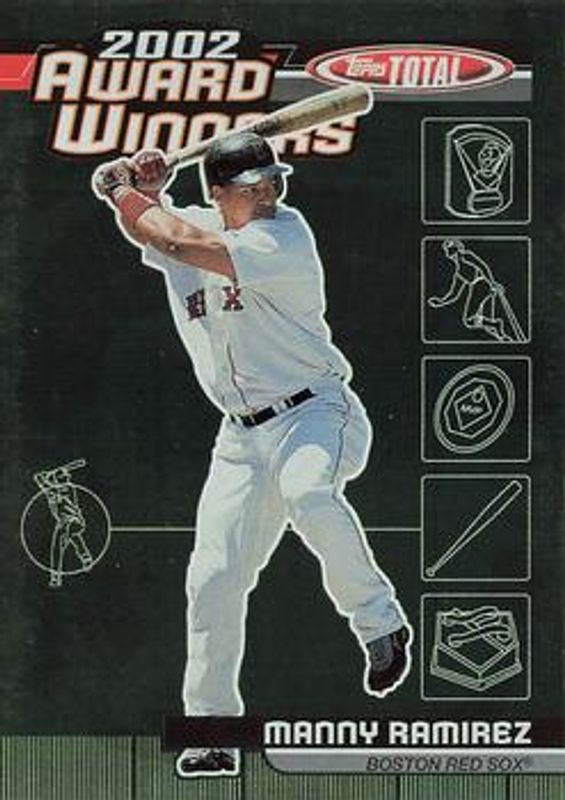 The Manny Ramirez 2003 Topps Total #AW22 Award Winners card is 1 of 5 Manny Ramirez's card variations in the 2003 Topps Total set being tracked by Sports Card Investor, including Base, Silver, Total Production, and Total Topps.