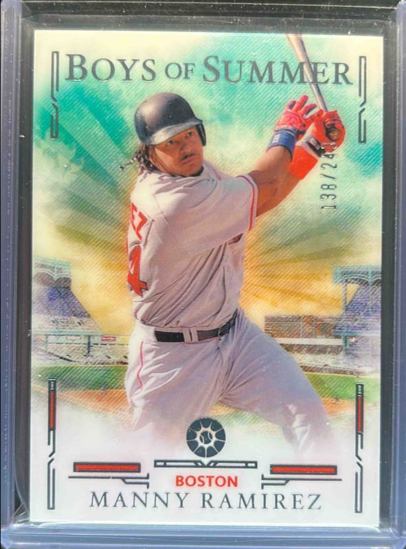 The Manny Ramirez 2025 Panini Boys of Summer #57 Base /249 card is 1 of 22 Manny Ramirez's card variations in the 2025 Panini Boys of Summer set being tracked by Sports Card Investor, including Red /175, Blue /99, Purple /49, Holo Silver /25, and Holo Gold /10.